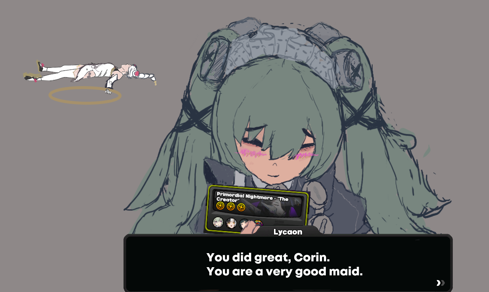 (画像翻訳: 原初の悪夢:『創造主』ライカオン「よくやったな、カリン。お前は最高にデキるメイドだ」)