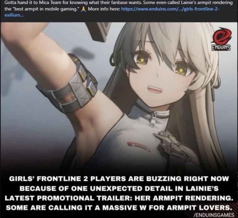 (画像翻訳: ユーザーが何を求めてるか分かってんな、さすがMica Teamだわ。レイニーの脇のグラフィックが「スマホゲー界で最高の脇」って言われてて草。最新PVの脇の描き込みが予想外すぎてドルフロ2界隈がざわついてる。