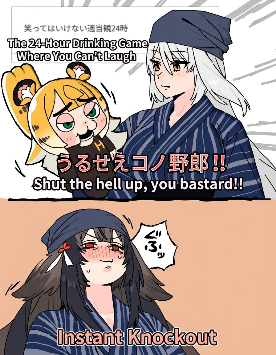 (画像翻訳: 笑ってはいけない適当24時(飲みゲー企画) うるせえこの野郎!! 即オチw)