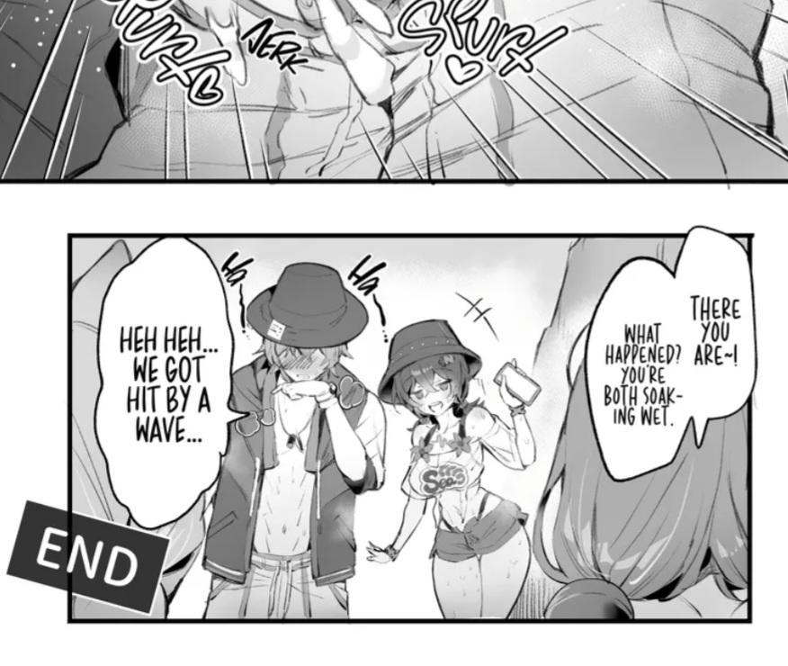 (画像翻訳: (ズルッ)ハッ、へへへ… 波にのまれたわ… どうしたんだ?二人ともずぶ濡れじゃねーか。スパッとおわり。)