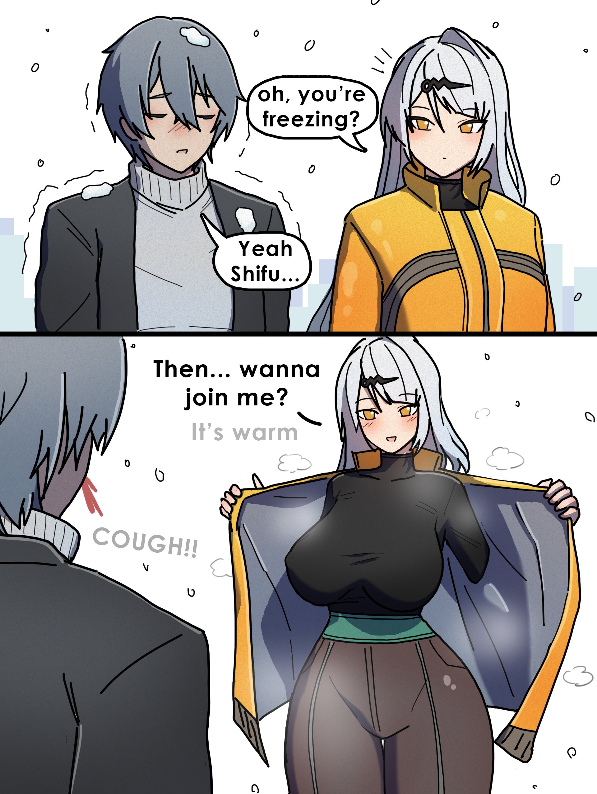 (画像翻訳: 「あら、凍えてるの?」「ああ、師匠……」「じゃあ……こっち来る? 暖かいわよ(ゴホッ!!)」)
