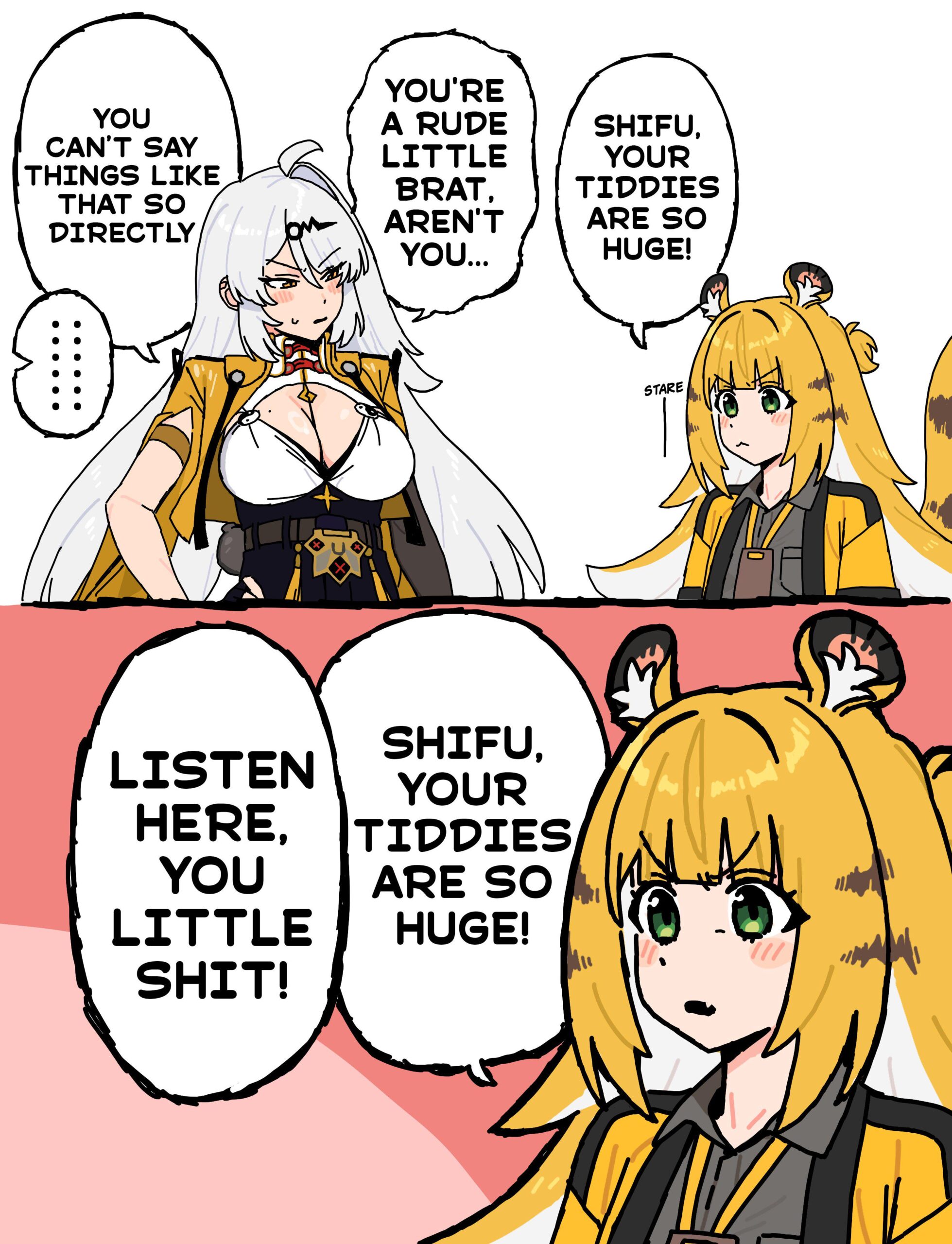 (画像翻訳: そんなストレートに言うもんじゃないわよ……生意気なクソガキね……「師匠、おっぱいデカすぎ!」「(ガン見)」「ちょっと聞きなさいよこのクソガキ!」「師匠、おっぱいデカすぎ!
