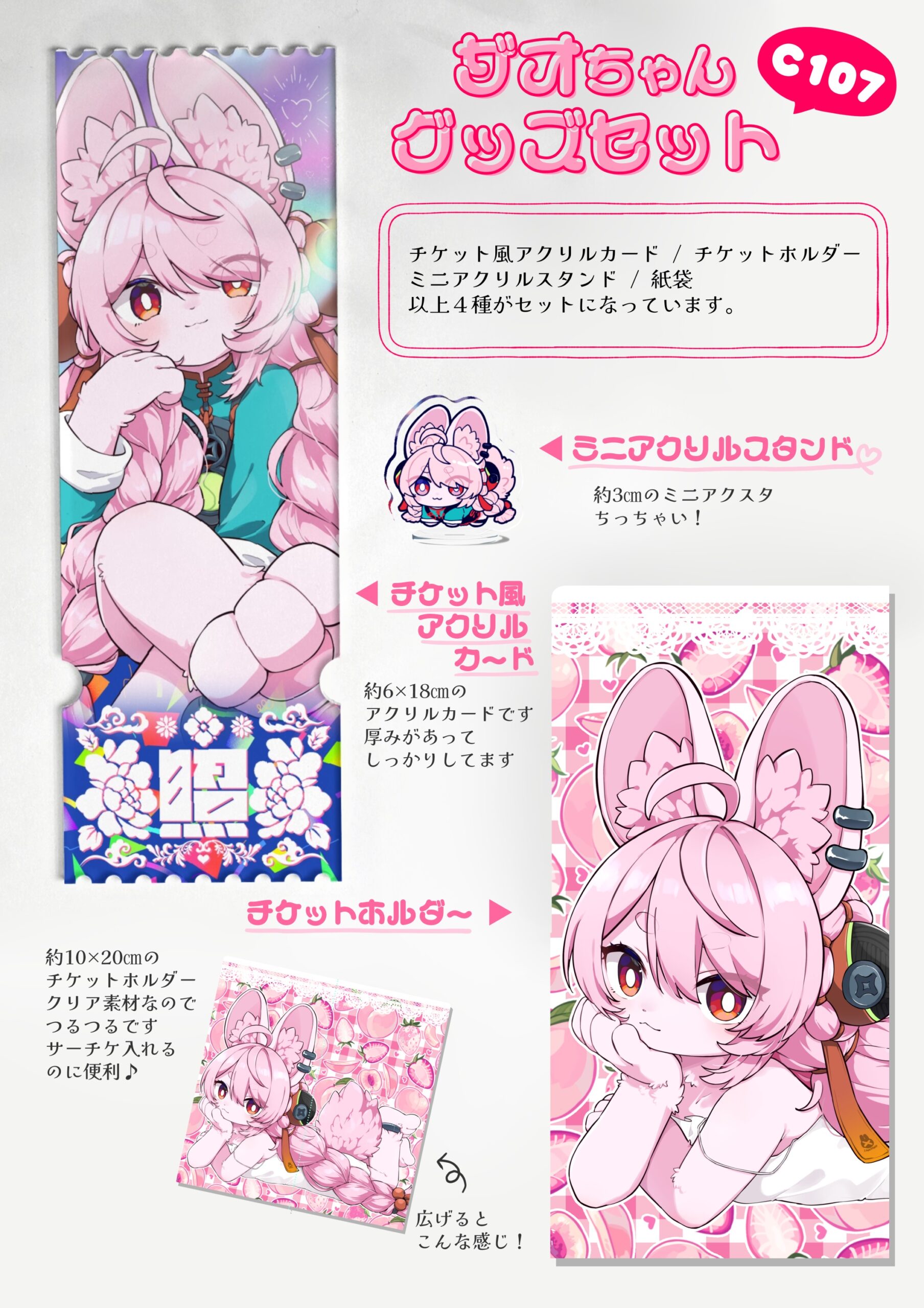(画像翻訳: ザオちゃんのC107グッズセット!チケ風アクカ、チケホ、ミニアクスタ、紙袋の4点詰め合わせ。3cmのミニアクスタちっちゃ!wアクカは6×18cmで厚みもあってガチなやつ。
