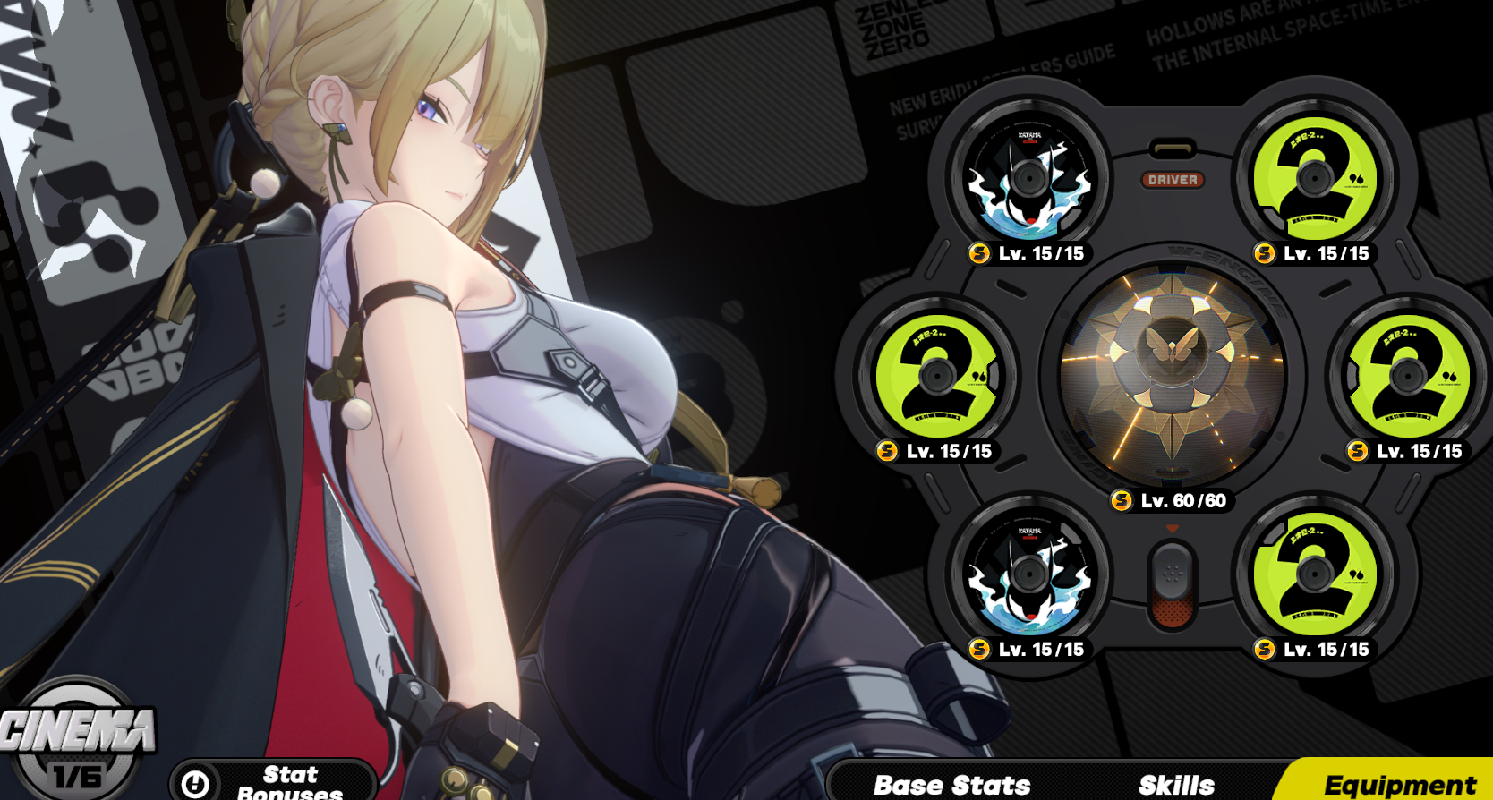 (画像翻訳: ゼンレスガイド。心象映画1/6(1凸)。ドライバディスクやらステータスやら全部レベルMAX。ガチ勢の育成済みキャラやな。)