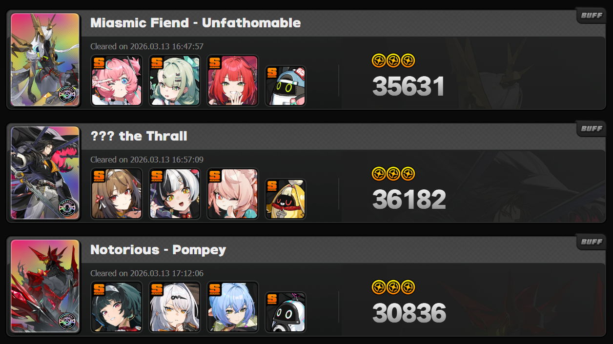 (画像翻訳: 瘴気の魔神(底知れぬバフw)2026.03.13 16:47にクリア。スコア35631。謎の奉仕者のバフも16:57にシバいてスコア36182。お尋ね者のポンペイも17:12に片付けてスコア30836。