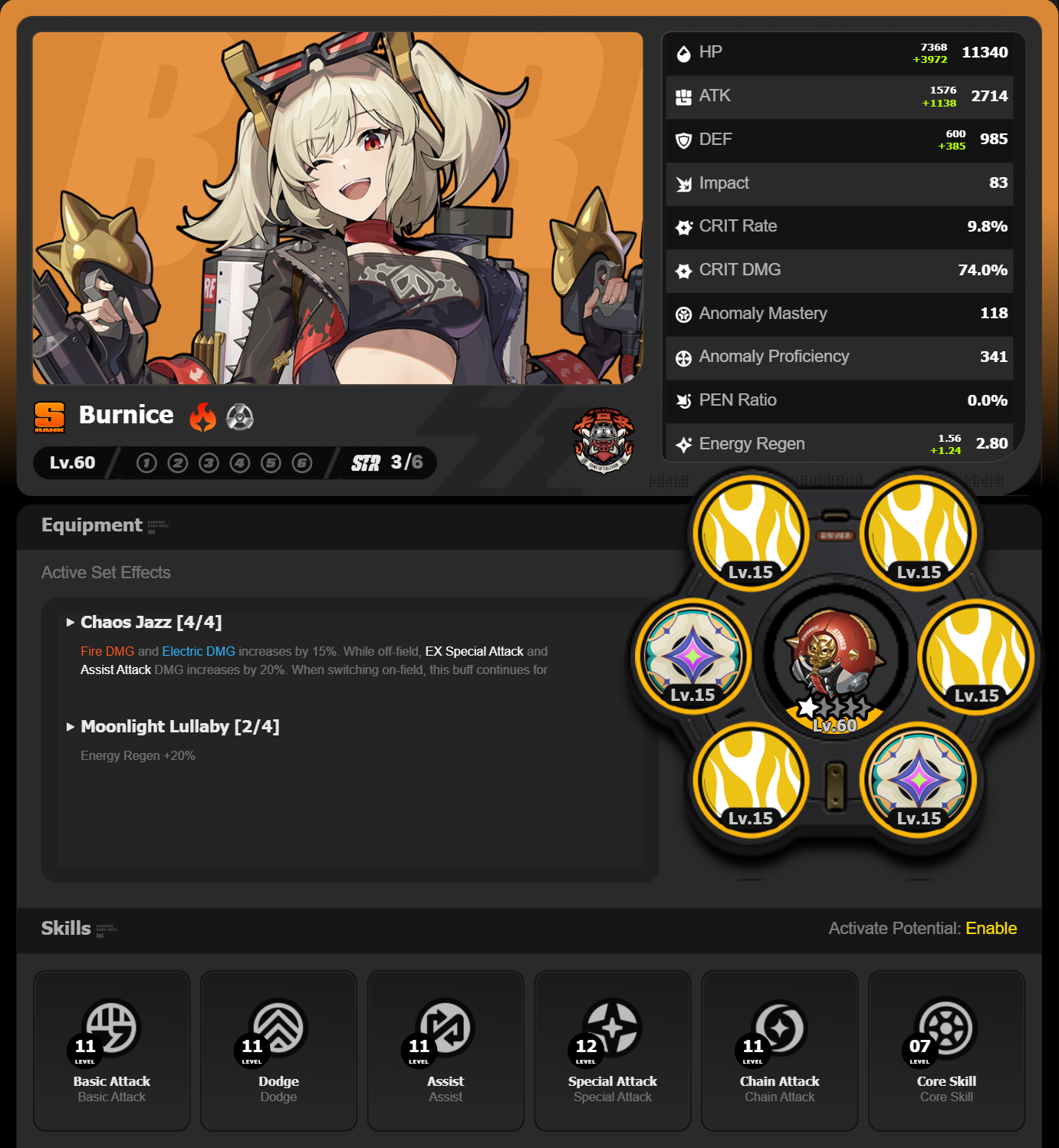 (画像翻訳: HP 7368 11340 +3972 +1138 攻撃 1576 2714 防御 600 985 衝撃 83 会心率 74.0% 会心ダメ 9.8% 異常マスタリー 118 異常掌握 341 貫通率 0.0% エネ自動回復 1.56 2.80 バーニス Lv.60 3凸/6 装備セット:カオスジャズ[4/4] 炎