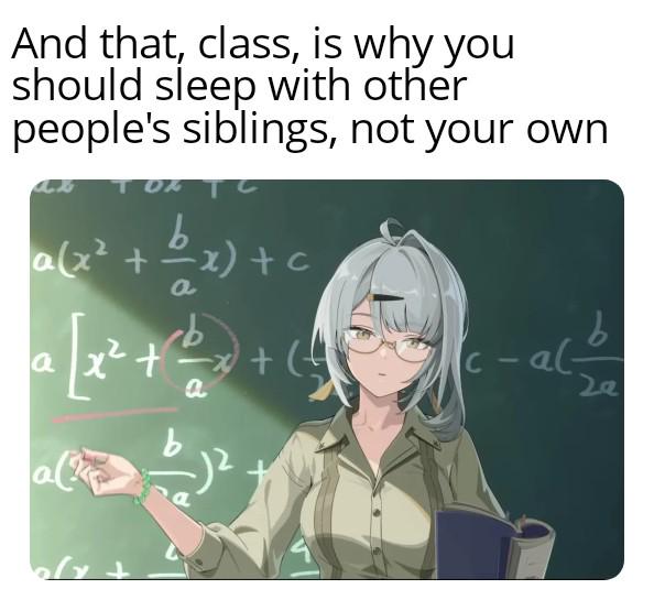 (画像翻訳: はい、というわけで諸君。これが「自分の兄弟じゃなく他人の兄弟と寝るべき理由」の証明だ。 a(x² + b/a x) + c a[x²+ b/a x] + c -a(b/2a)² a(x² + (b/a)x + (b/2a)²) + c – a(b/2a)²)